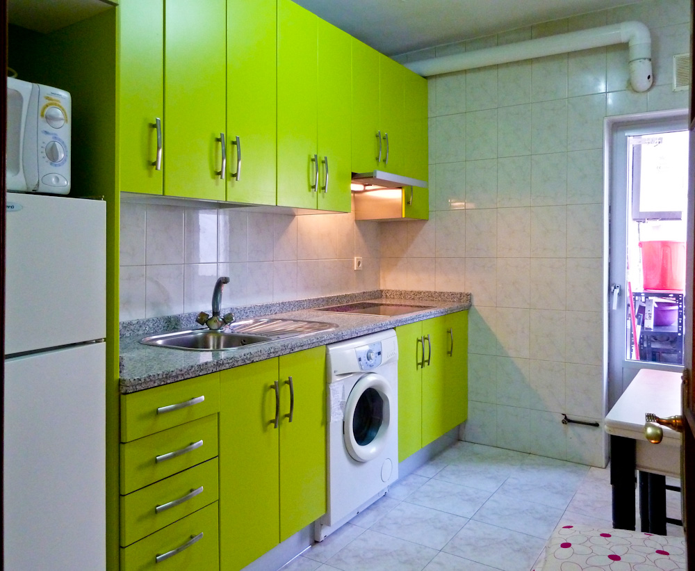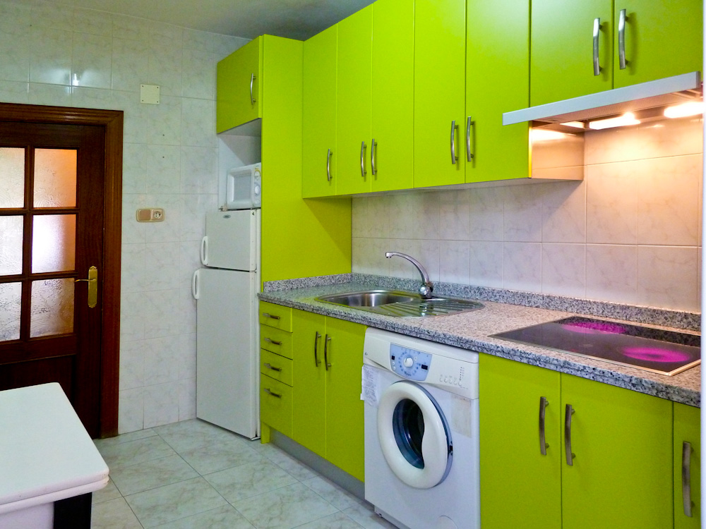 Cocina con lavadora, microondas, frigorífico, terraza...